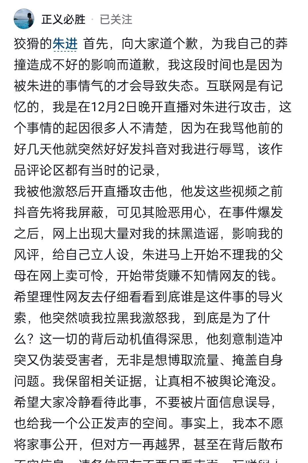因着之前的种种不好行为,弟弟说自己愿意道歉,但是事情的真相绝对不是朱进说的那样。以上的通篇言论都是弟弟在说朱进,至于朱进到底说了个什么事情,导致一家人决裂,弟弟由始至终都没有放出来。